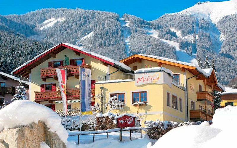 Wie houdt van een kleinschalig hotel met persoonlijke touch én ski‑in/ski‑out bij goede sneeuw, zit hier goed. Boutique Hotel Martha ligt rustig boven Zell am See, met roodgeschilderde luiken en houten balkons die je zo van een ansichtkaart kent. Bij voldoende sneeuw ski je 's ochtends letterlijk de deur uit en 's avonds tot aan de ingang terug, en anders stopt de skibus vlak voor het hotel. Na een dag op de piste kun je bijkomen in de wellness met sauna en stoombad, of een lokaal gerecht bestellen in restaurant Flo's met zijn moderne twist op de traditionele keuken. Extra fijn: er is een laadpunt voor elektrische auto's en je trouwe viervoeter is ook welkom.
