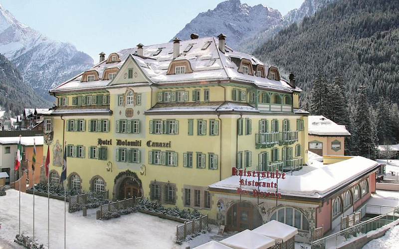 In een historisch kasteel uit 1909 verblijven met fresco's van keizerin Sissi aan de muur, dat maak je mee bij Schloss Hotel Dolomiti. Dit imposante 4‑sterrenhotel in het centrum van Canazei ademt Habsburgse allure en biedt alles binnen handbereik: de skipiste en skilift liggen op loopafstand, dus je bent zo vertrokken. Zin om even bij te komen? In het wellnesscenter vind je een jacuzzi, sauna en Turks stoombad. Voor de maaltijden hoef je de deur niet uit met keuze uit een pizzeria en een à‑la‑carterestaurant .